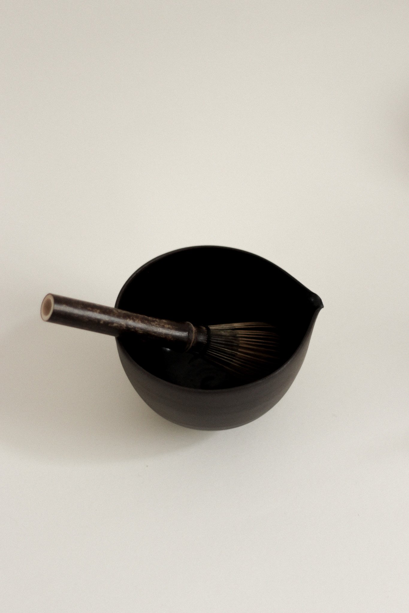 made on pottery wheel with black stoneware clay that will beautifully show off green colour of your matcha tea. Has a round-profiled bottom for creating perfect microfoam.