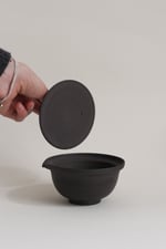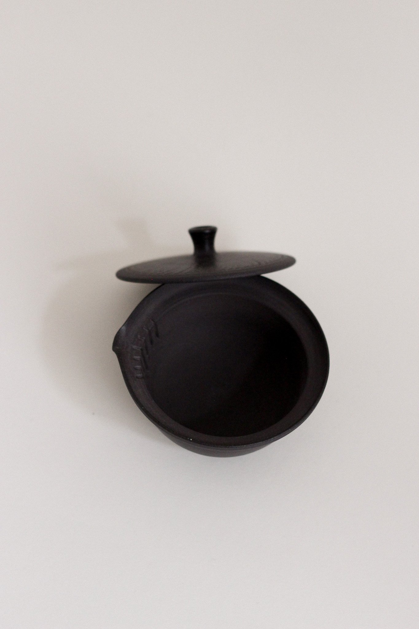 made on the pottery wheel from black stoneware. unglazed, polished.